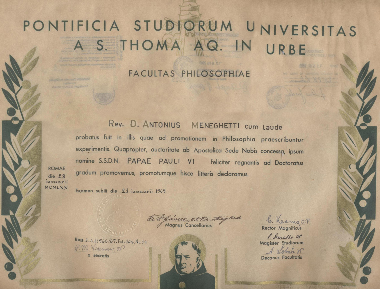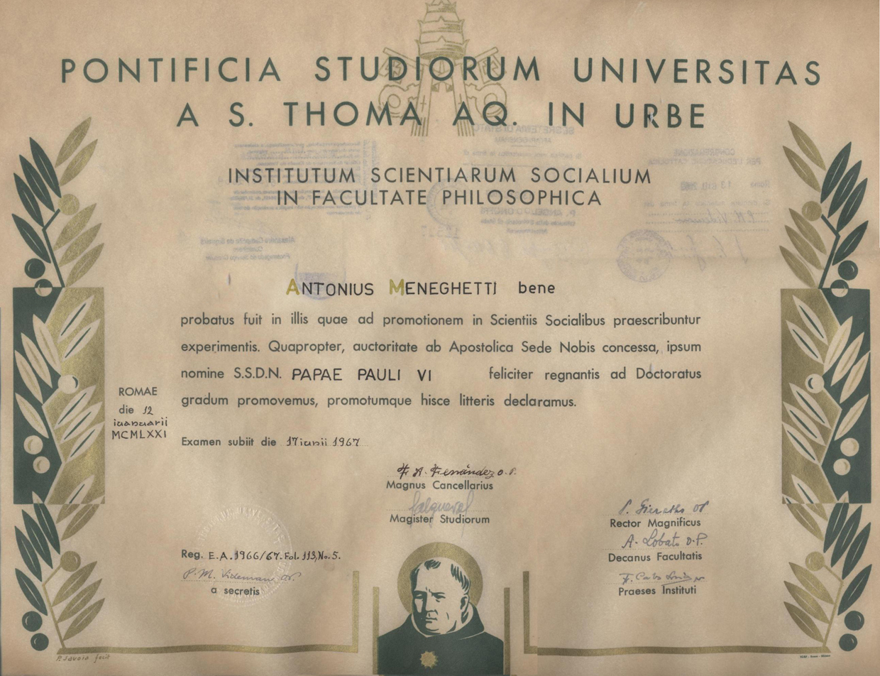 В 1970 году декан факультета философии Папского университета святого Фомы Аквинского в Риме Абелардо Лобато Казадо приглашает Антонио Менегетти читать курс лекций по психологии для студентов, получающих второе высшее образование.