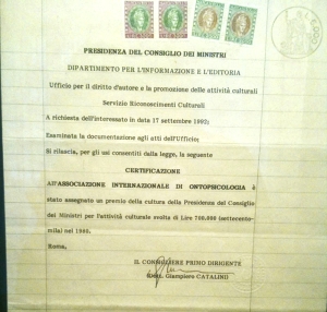 Президиум совета министров Италии присуждает Международной ассоциации онтопсихологии премию в области культуры.