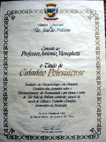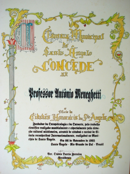 А палата муниципальных депутатов г. Рестинга Сека присваивает А. Менегетти звание Почетного гражданина города (штат Рио Гранде до Сул, Бразилия).